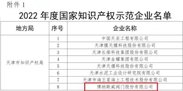 “國家知識產(chǎn)權(quán)示范企業(yè)”是國家對企業(yè)知識產(chǎn)權(quán)創(chuàng)造、運用、保護、管理等方面工作表現(xiàn)授予的最高榮譽,是國家給予企業(yè)知識產(chǎn)權(quán)管理工作的最高評價。截至目前,公司共取得授權(quán)專利247項,其中發(fā)明專利14項,實用新型專利170項,外觀設(shè)計專利63項;注冊國內(nèi)商標(biāo)263項,注冊國外商標(biāo)16項,“BNSV”商標(biāo)曾認(rèn)定過天津市著名商標(biāo);取得箸作權(quán)登記證書1項,作品登記證書16項;公司2017年被認(rèn)定為國家知識產(chǎn)權(quán)優(yōu)勢企業(yè)、2018年獲得“天津市專利優(yōu)秀獎”、2020年被認(rèn)定為天津市商標(biāo)戰(zhàn)略實施示范企業(yè)。2021年被評為天津市閥門行業(yè)企標(biāo)“領(lǐng)跑者”。并取得知識產(chǎn)權(quán)管理體系認(rèn)證。創(chuàng)新引領(lǐng)發(fā)展,此次入選“國家知識產(chǎn)權(quán)示范企業(yè)”,是博納斯威實現(xiàn)知識產(chǎn)權(quán)強企之路上又一個重要的里程碑。未來,博納斯威將繼續(xù)科技創(chuàng)新,提升自主研發(fā)實力和核心競爭力。