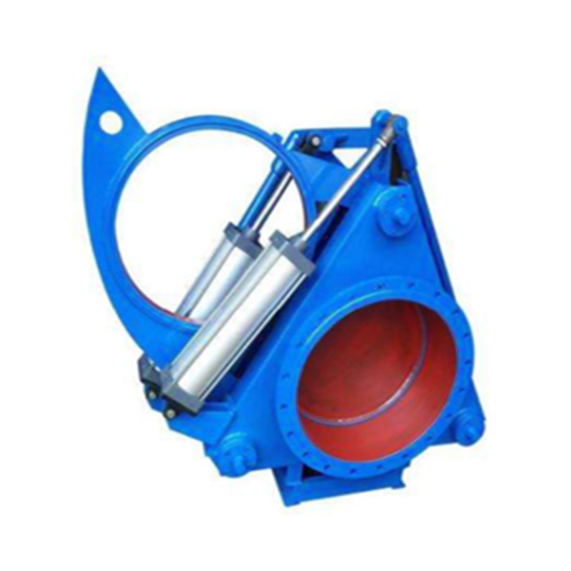 主要由左閥體、右閥體、絲桿、閘板、密封圈、杠桿、汽缸等零件組成,并由底座、支撐柱構(gòu)成一個剛性結(jié)構(gòu)體。閥門中設(shè)有夾緊、松開汽缸和翻板汽缸,夾緊、松開汽缸通過杠桿和絲桿螺旋驅(qū)動左、右閥體完成松開、夾緊動作,翻板汽缸驅(qū)動閘板完成開關(guān)動作。橡膠密封圈鑲鉗在閘板上,具有耐高溫、密封性能好、更換方便、使用壽命長等特點。