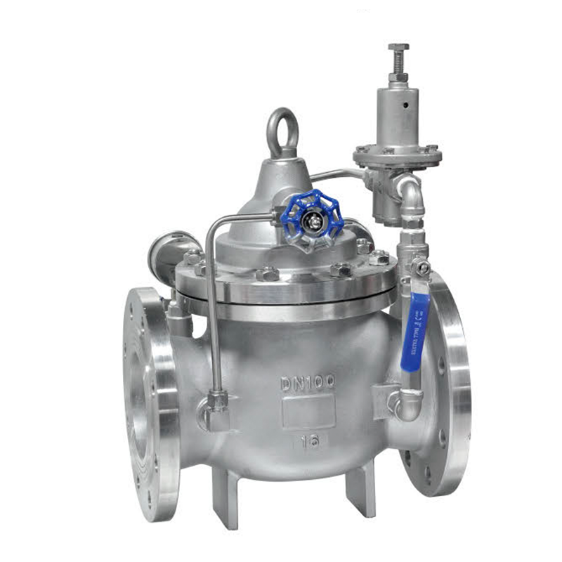 本產(chǎn)品適用工礦企業(yè)、高層建筑、生活用水、消防用水系統(tǒng)中使用,需要減靜壓和動(dòng)壓的場(chǎng)合可以取代中間水箱,節(jié)約建筑中間水箱的費(fèi)用,擴(kuò)大建筑物使用的空間。閥體采用流線型設(shè)計(jì),流體阻力小,流量大。在傳動(dòng)方式上采用了水力操作,即利用管路中的水壓自動(dòng)操作主閥盤(pán)的上下移動(dòng),控制閥口開(kāi)度,調(diào)節(jié)下游壓力,使下游壓力維持在導(dǎo)閥彈簧設(shè)定的壓力值上。當(dāng)下游壓力超過(guò)設(shè)定值時(shí),減壓閥將自動(dòng)關(guān)閉,不管入口壓力P1怎樣波動(dòng),都可輸出穩(wěn)定的出口壓力P2。不管下游流量怎樣變化,都能維持出口壓力P2穩(wěn)定在導(dǎo)閥設(shè)定值上。出口壓力調(diào)節(jié)范圍大,且工作平衡,無(wú)水錘沖擊現(xiàn)象。