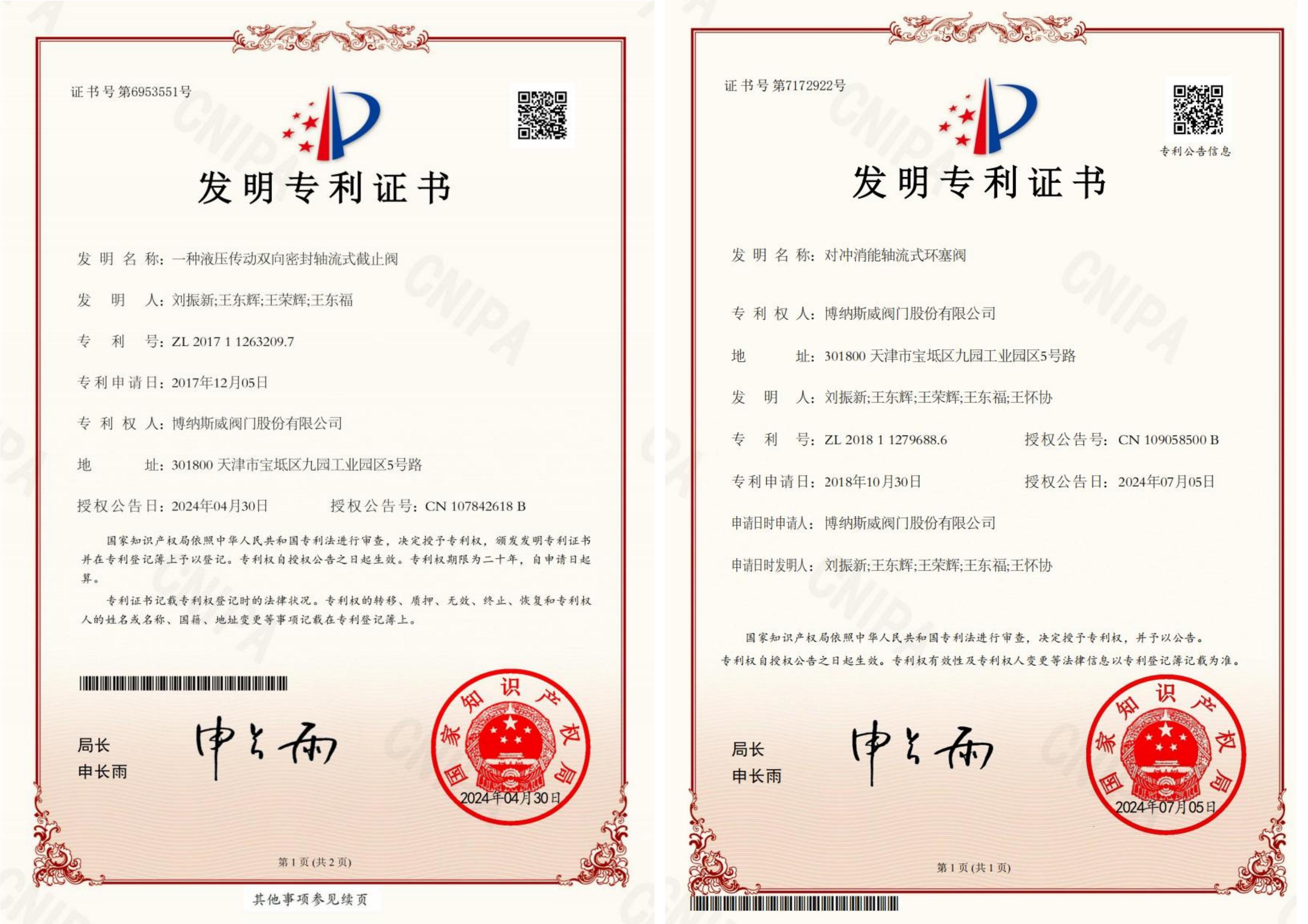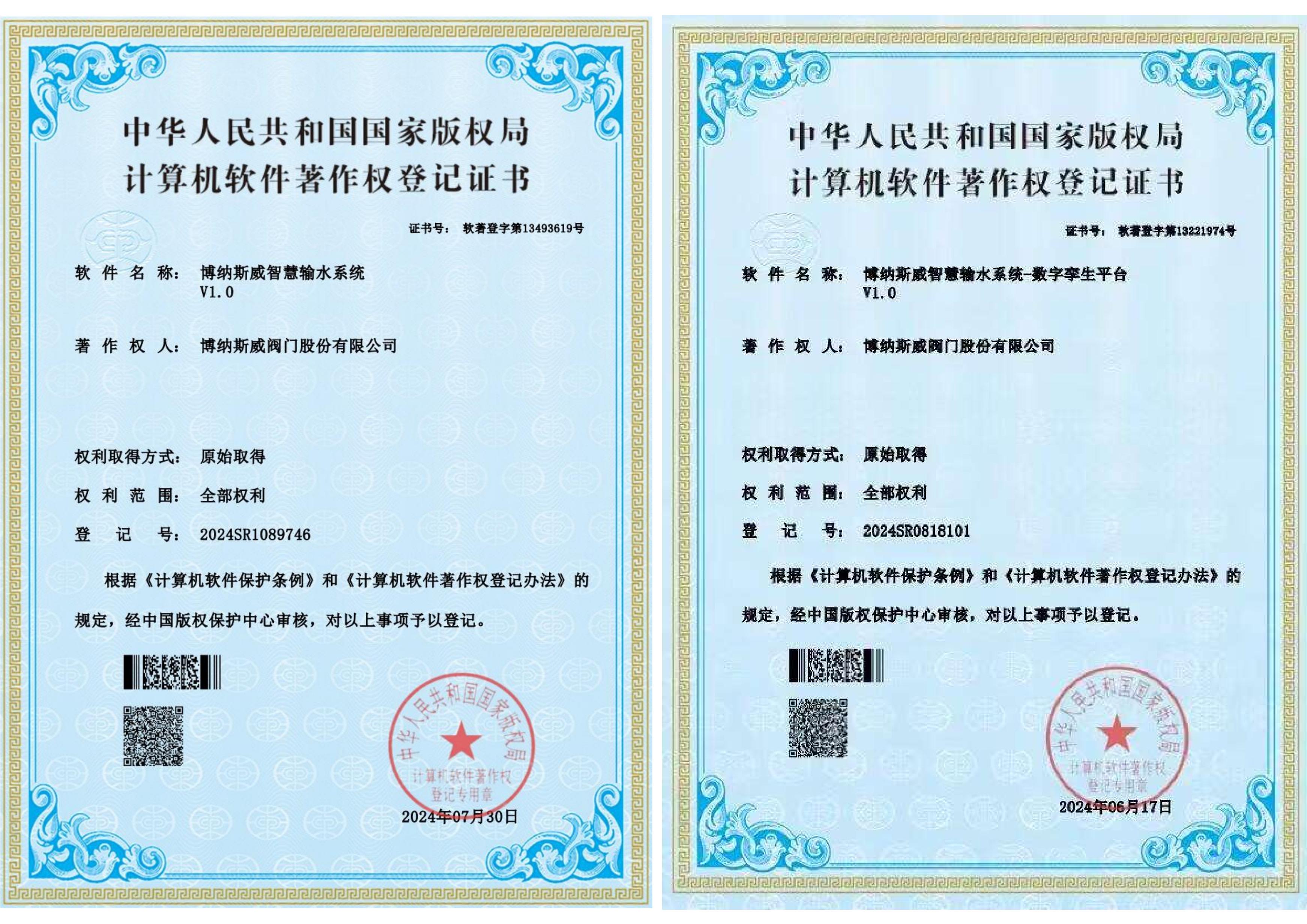 博納斯威智慧輸水系統-數字孿生平臺、博納斯威智慧輸水系統、博納斯威智慧輸水系統-水錘監測平臺、空氣閥智能監控系統、智能調節閥控制系統五項新技術獲得了國家版權局授權軟件著作權。六項發明專利包括一種用于測量閥門進氣量的檢測裝置、一種排氣閥的檢測裝置、對沖消能軸流式環塞閥、一種液壓傳動雙向密封軸流式截止閥、管道安全控制用雙速油缸以及爆管保護安全裝置。